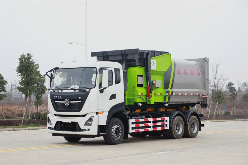 該款鉤臂式垃圾車由液壓系統、操作系統組成。舉升油制缸(1支)系國內知名液壓件廠家生產的雙作用油缸。垃圾廂可自吊上放下,可自行傾倒垃圾,上下一次工作循環時間≤50S。該車的特點是一個車能配多個垃圾廂,能實現一臺車與多個垃圾廂聯合作業,循環運輸,充分提高了車輛的運輸能力。