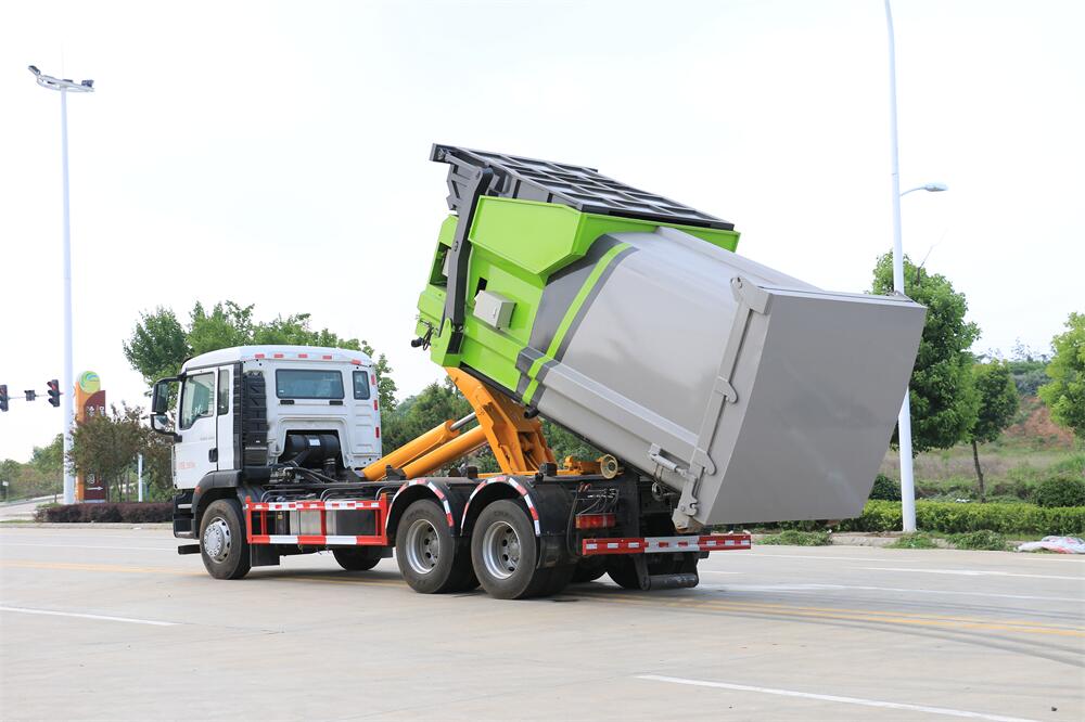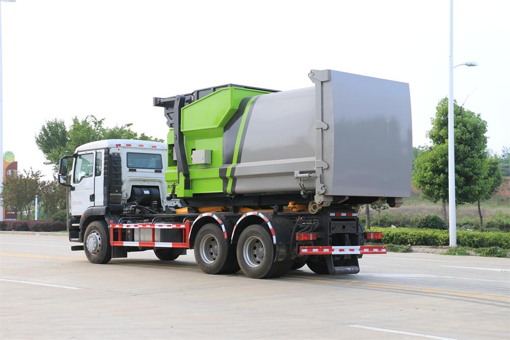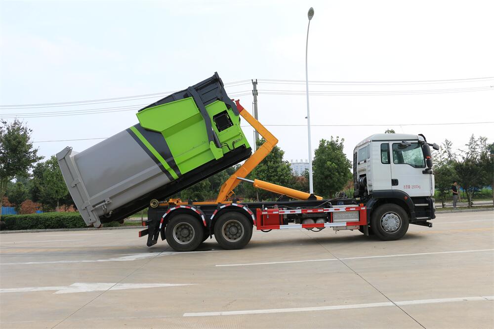 勾臂式垃圾車(車廂可卸式垃圾車)介紹: 車廂可卸式垃圾車又叫拉臂式垃圾車,是一種采用高新設計可伸縮的鉤臂,實現垃圾廂的二次吊裝,自吊上放下,可自行傾倒垃圾的環(huán)衛(wèi)設備。 拉臂式垃圾車結構簡單,操作穩(wěn)定方便,裝卸效率高,機械化程度高,節(jié)省人力。鉤臂垃圾車一車可帶多個垃圾廂,在裝卸的運輸過程中可有效地避免二次污染。 拉臂垃圾車采用高新設計可擺動的鉤臂,垃圾箱由框架、開啟油缸、滑輪、后門和若干加強框架與鋼板焊接而成。調換貨廂快捷方便,貨廂上帶蓋(倒垃圾時可翻開),鉤臂垃圾車垃圾廂體可選用碳鋼、不銹鋼材質、內部采取環(huán)氧樹脂防腐處理,改裝部分與原車底盤為可分離式,維修方便且保持了原車的機動性及行駛性能。