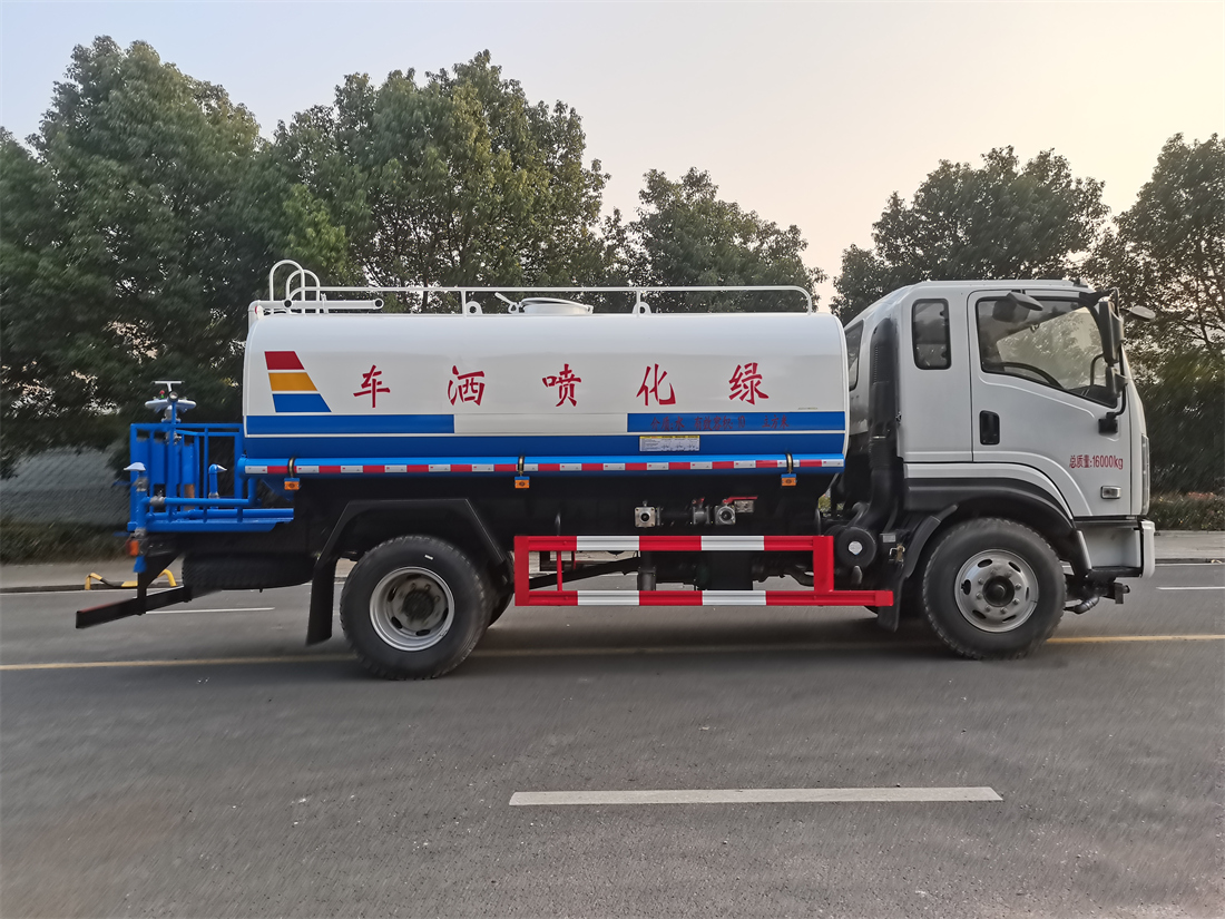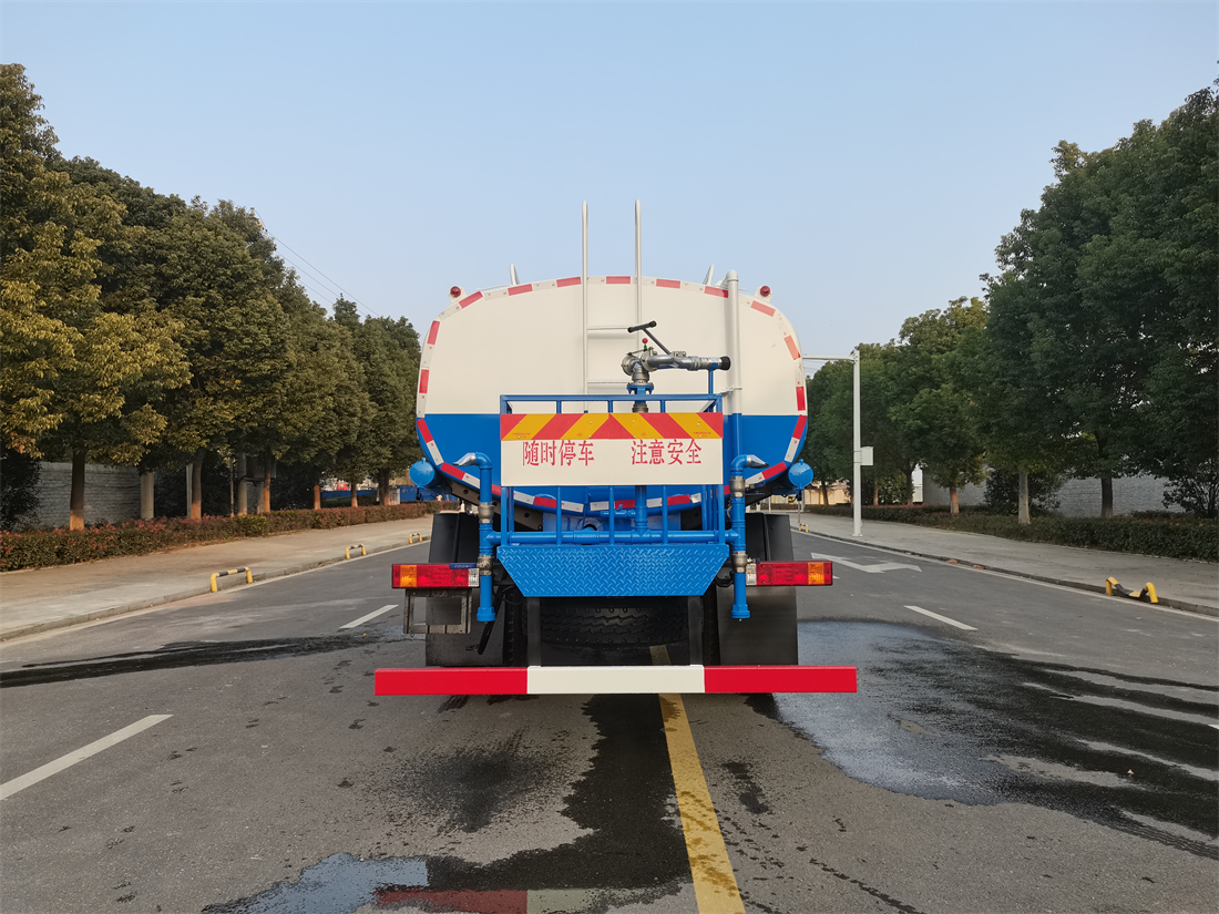 灑水車前裝有鴨形噴嘴或圓頭沖嘴,后面裝有圓柱開灑水噴嘴或蓮蓬頭噴嘴,后部有一工作平臺,裝配有水炮。后部還可裝8個噴嘴(選裝)。