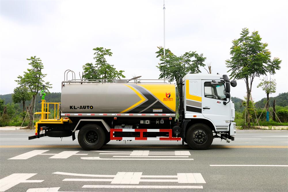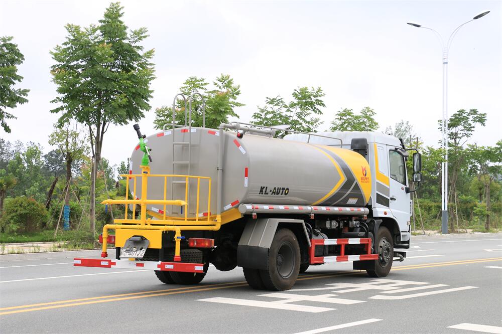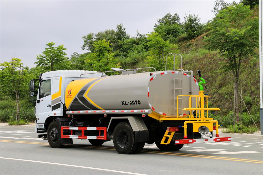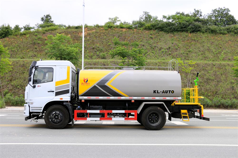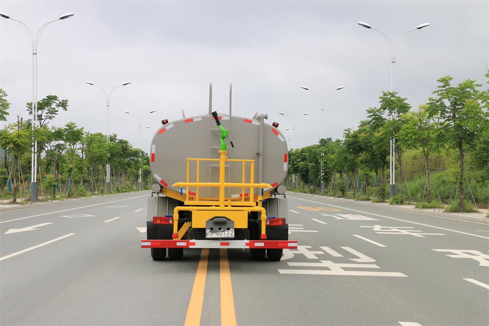 灑水車前裝有鴨形噴嘴或圓頭沖嘴,后面裝有圓柱開(kāi)灑水噴嘴或蓮蓬頭噴嘴,后部有一工作平臺(tái),裝配有水炮。后部還可裝8個(gè)噴嘴(選裝)。
