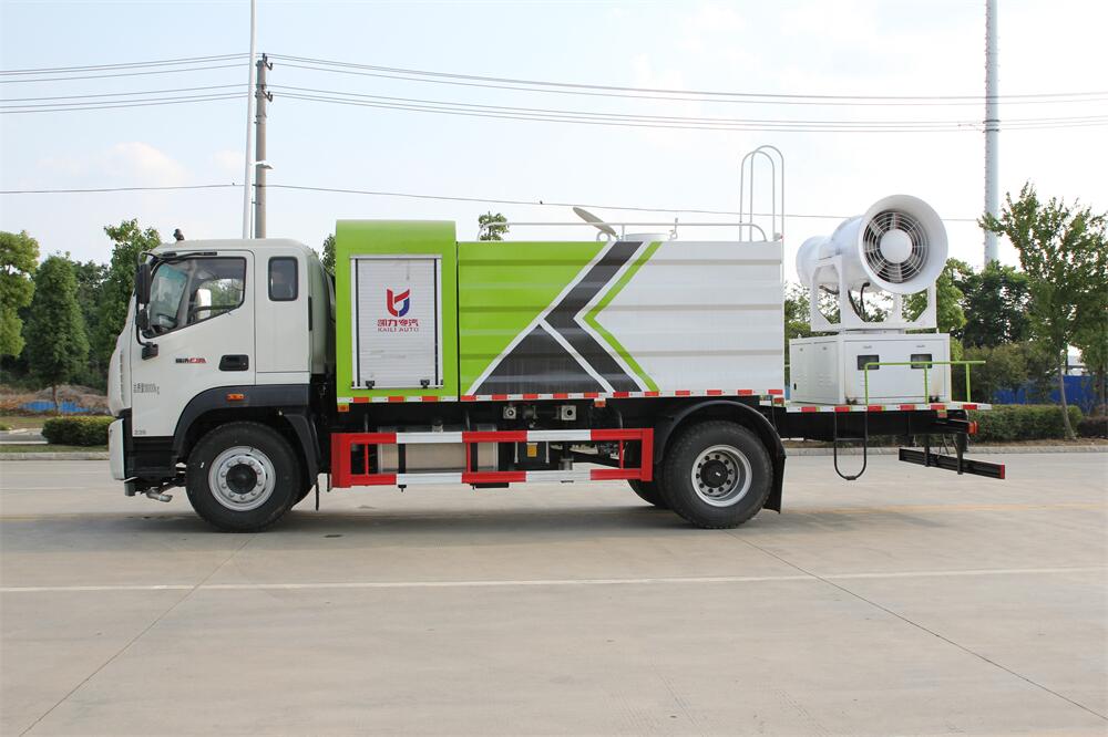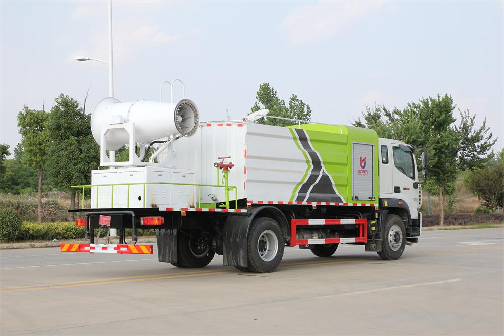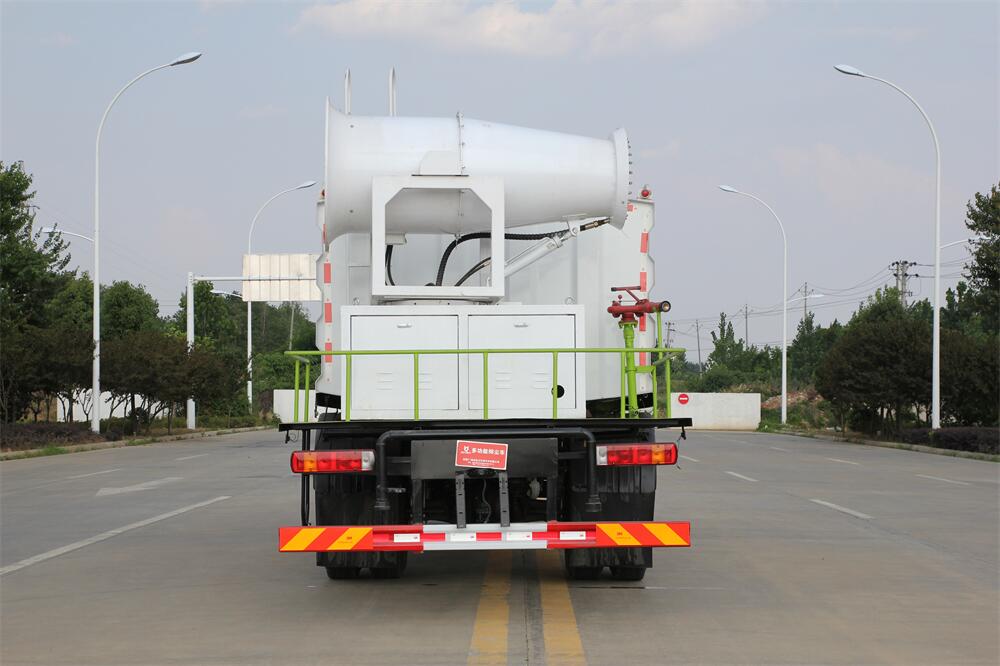 上裝配置:罐體容積為 12立方,選配風(fēng)送式霧炮機(jī)組射程30米、40米、50米、60米、80米、100米、120米霧炮,罐體鋼板為4mm碳鋼Q235材質(zhì),罐內(nèi)隔板具有防波作用,以減輕汽車(chē)行駛時(shí)罐體液體沖擊,罐體及整車(chē)外形尺寸按照公告。帶大功率專用灑水泵,泵可自吸自排,整車(chē)前沖、后灑、側(cè)噴、帶65消防接口,后平臺(tái)配CLW-50、CLW-60、CLW-80、CLW-100、CLW-120型風(fēng)送式霧炮機(jī)組;罐體前封頭配大功率柴油發(fā)電機(jī)組;前封頭帶水位計(jì),后平臺(tái)主管路帶1寸澆花接口,后爬梯。帶兩根輸水管及陰陽(yáng)端。罐體顏色:銀/灰/綠,罐體兩側(cè)噴“多功能抑塵車(chē)”字樣,貼反光標(biāo)示。