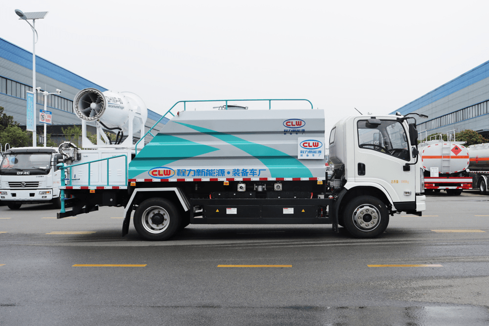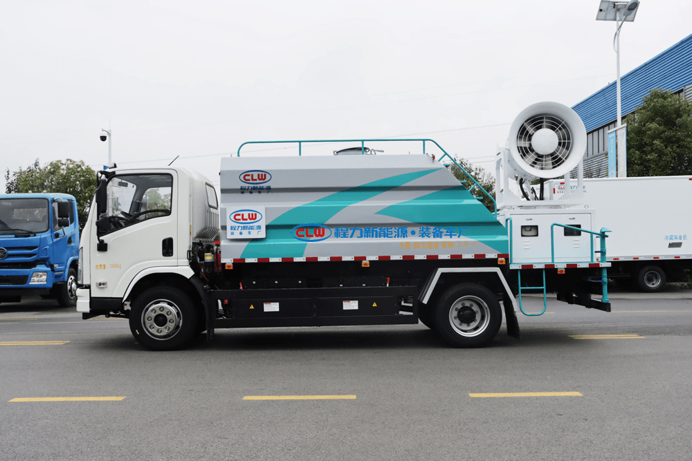 上裝配置:罐體容積為 16立方,選配風(fēng)送式霧炮機組射程30米、40米、50米、60米、80米、100米、120米霧炮,罐體鋼板為4mm碳鋼Q235材質(zhì),罐內(nèi)隔板具有防波作用,以減輕汽車行駛時罐體液體沖擊,罐體及整車外形尺寸按照公告。帶大功率專用灑水泵,泵可自吸自排,整車前沖、后灑、側(cè)噴、帶65消防接口,后平臺配CLW-50、CLW-60、CLW-80、CLW-100、CLW-120型風(fēng)送式霧炮機組;罐體前封頭配大功率柴油發(fā)電機組;前封頭帶水位計,后平臺主管路帶1寸澆花接口,后爬梯。帶兩根輸水管及陰陽端。罐體顏色:銀/灰/綠,罐體兩側(cè)噴“多功能抑塵車”字樣,貼反光標示。