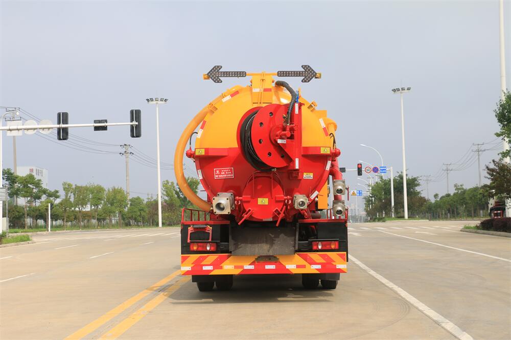 上裝配置:清水罐約 5 立方,污水罐約 10 立 方;罐體 8mm 厚,封頭 8mm 厚,水罐、污罐可 互通,用 100 球閥**開關(guān);清洗部份采用天 津通潔高壓泵,壓力 19Mpa,流量 215L/min, 配 80 米直徑 22 高壓管帶液壓卷盤;吸污部份 采用濰柴375馬力副發(fā)動機(jī)帶山東SK-30水循 環(huán)泵(副發(fā)自帶),吸污罐帶舉升,后封頭焊 死(可選擇后封頭全開),尾部加裝一個 600mm 快開,罐體后尾部一個 DN150 排污口球閥,一 個 DN100 吸污球閥帶出口盤,一個視污窗,一 根 10m 吸污管,一套陰陽端,壓力表,防溢 閥,箭頭燈,工具箱,淋管裝置,高壓泵帶氣 吹水。配一個 4.5 公斤水雷噴頭,另帶一個 80 公分手持洗車噴頭。