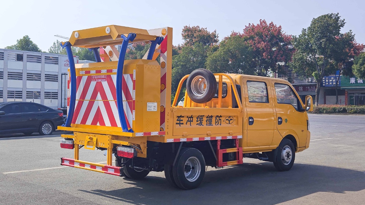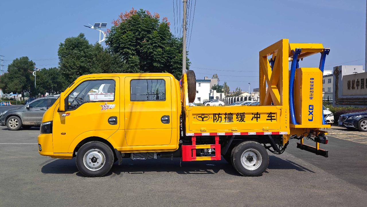 上裝配置:采用Q235國標邊板,底板花紋板,不銹鋼合頁,箱體后部防撞緩沖模塊包采用暢行達70K防撞緩沖模塊,防撞緩沖吸能模塊主要由車載防撞緩沖墊和導(dǎo)向標志架組成,充當施工作業(yè)車輛后方的緩沖衛(wèi)士。